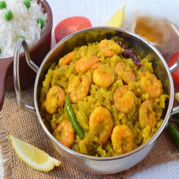 Prawns are cooked in colocasia (kachu pata) leaves with spices for a unique, earthy taste. This rice-friendly cuisine smells fantastic and is somewhat bitter. Seafood lovers’ delight.