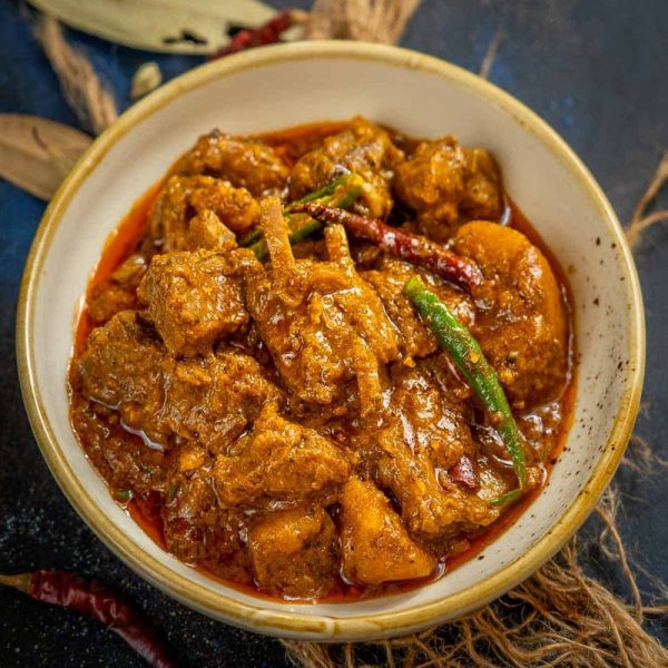 The Mutton Kosha Combo features robust and flavorful spices. Serve with crispy luchi or hot steaming rice. The delicate beef absorbs the flavorful spices, providing a satisfying dinner.