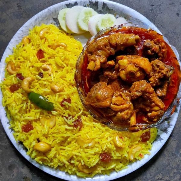 A fragrant rice dish with entire spices that complements tender chicken stew. The thick chicken curry complements the light, fragrant pulao.