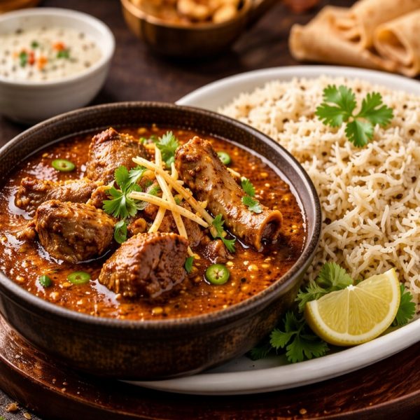Mutton curry consists of slow-cooked mutton (goat or lamb) in a spicy gravy, Presented alongside rice.
