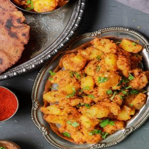 A simple classic Gujarati style dry potato preparation tempered with mustard seeds green chilies and mild spices perfect with puris or thepla