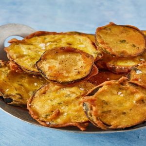 Small portion of fried Bengali beguni, freshly made and served hot.
