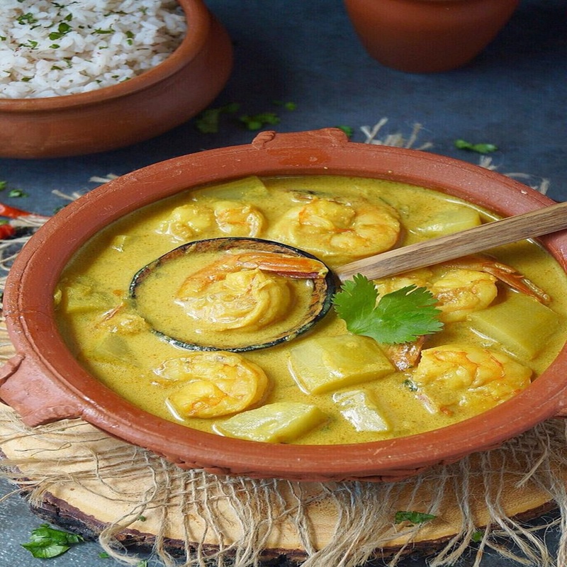A mild curry style dish where cauliflower and prawns are cooked together in white caldin gravy and served with rice, giving a gentle flavorful meal that is light and comforting.