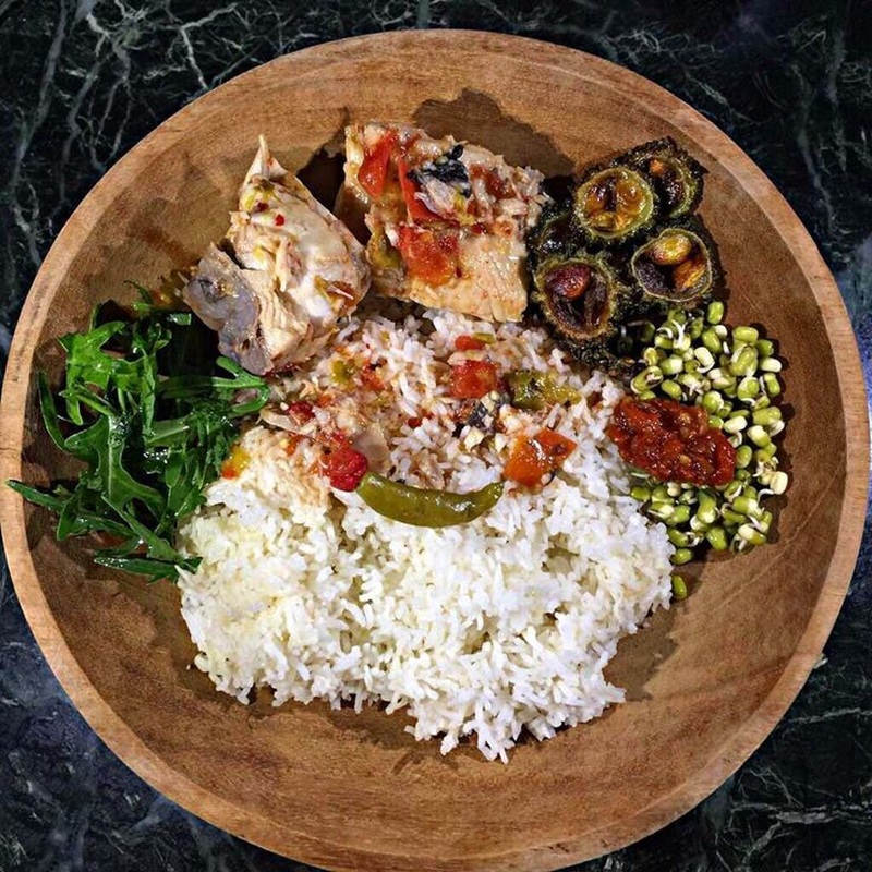 A wholesome meal with home-style chicken curry served with steamed rice, fresh vegetables, and tangy chutney for a perfect comfort plate.