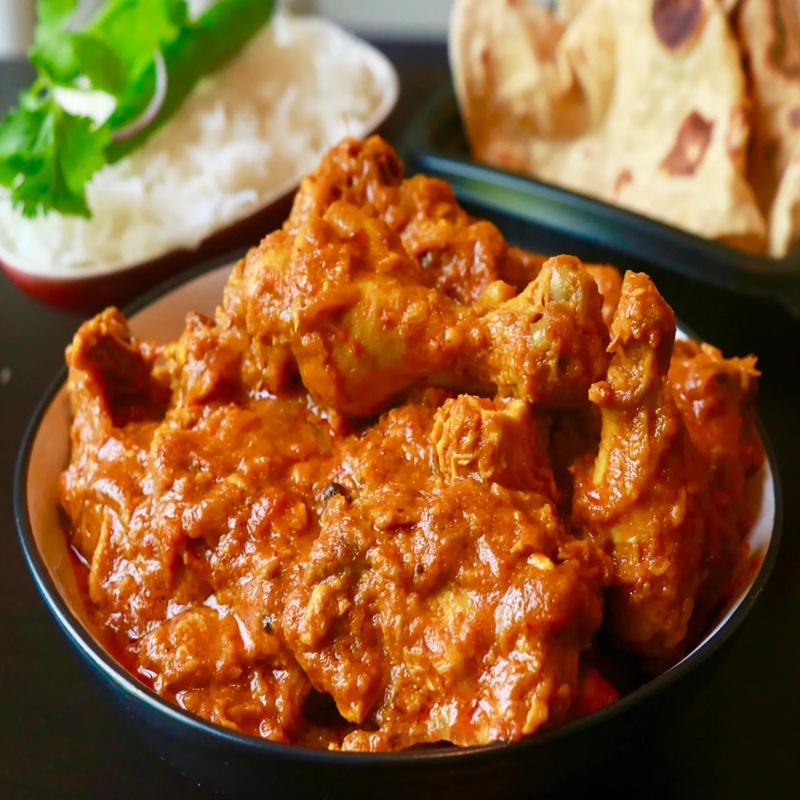 A comforting Bengali thali showcasing slow cooked chicken kosha paired with steamed rice, soft parathas and fresh salad. Rich, aromatic and satisfying, this platter captures the essence of classic Bengali cooking.