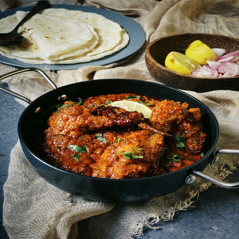 A dry chicken preparation cooked with roasted coconut and red chili masala delivering a bold spicy taste with rich aroma and satisfying texture.