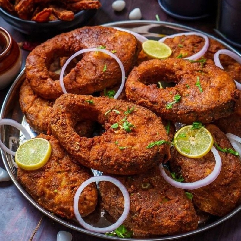 Marinating fish fillet in a spicy onion coriander paste, double coating it with an egg mixture and breadcrumbs, and then deep frying it until crispy