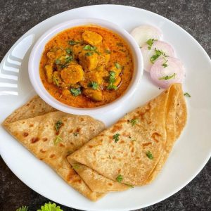 A traditional Rajasthani dish made with steamed gram flour dumplings simmered in a flavorful yogurtbased gravy, served with soft parathas.