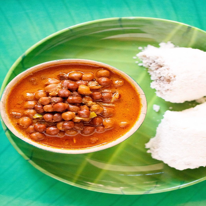 Delicate steamed rice noodle nests (Idiyappam) served with hearty and spiced black chickpea curry (Kadala Curry) for a wholesome and flavourful Kerala-style meal.
