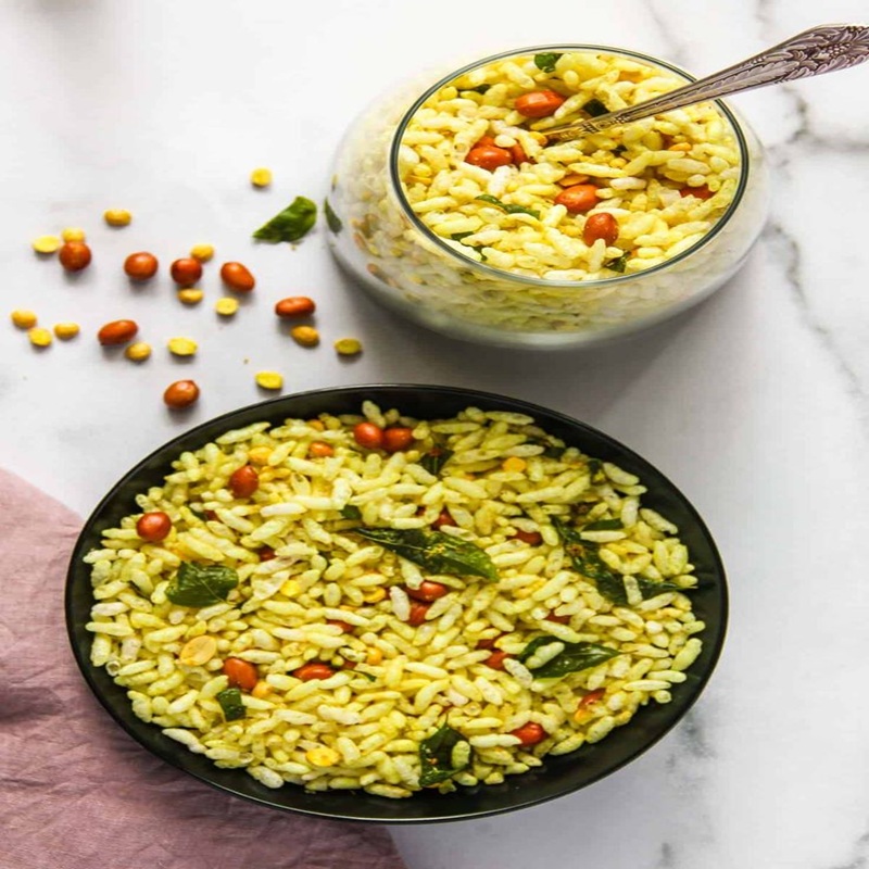 Crispy puffed rice tossed with roasted peanuts sev and aromatic spices a light flavourful munch that is hard to resist