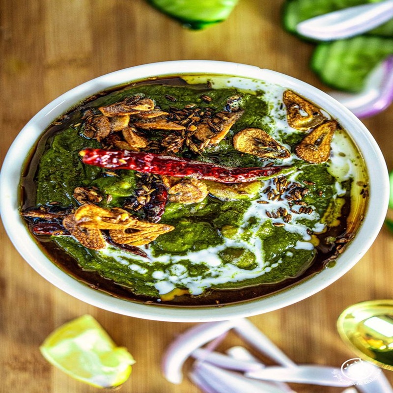 Smooth spinach-based gravy infused with garlic and gentle spices, resulting in a nutritious, aromatic curry served with paratha.