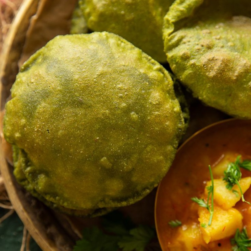 Palak Puri features crisp spinach infused puris paired with a hearty, thick potato curry. This traditional combination is packed with rustic Indian flavors.
