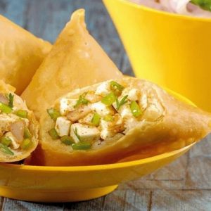Crispy samosa stuffed with soft paneer and sauteed onions mildly spiced for a rich satisfying flavor