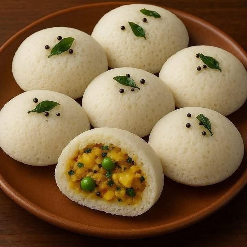 Idli batter is poured into molds with a spiced potato stuffing Steamed until soft and fluffy served hot with chutney.