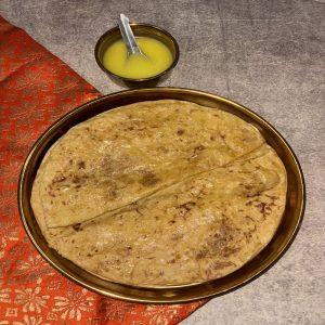 A traditional Maharashtrian stuffed sweet roti made with a golden outer layer and a rich filling of chana dal and jaggery. Lightly spiced with cardamom and roasted on a tawa with ghee, it’s a festive favorite best enjoyed warm.