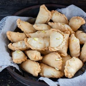 Traditional festive sweet made with semolina dough stuffed with a rich filling of coconut, sugar, and dry fruits, then deepfried to golden perfection for a crunchy and delightful bite.