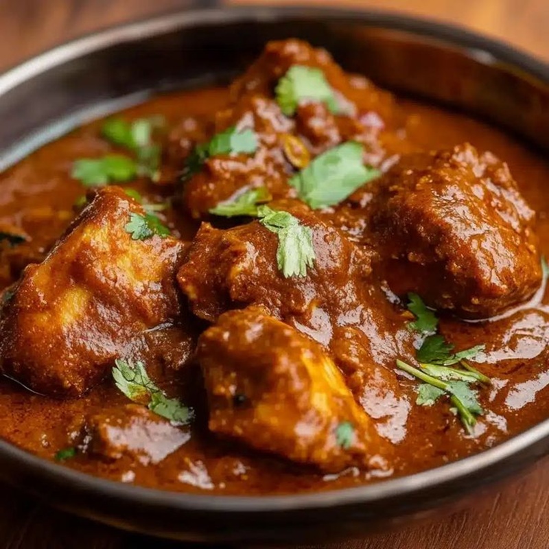 Chicken cooked in a deep, aromatic Kashmiri-style gravy infused with warming spices, creating a rich and satisfying dish with paratha.