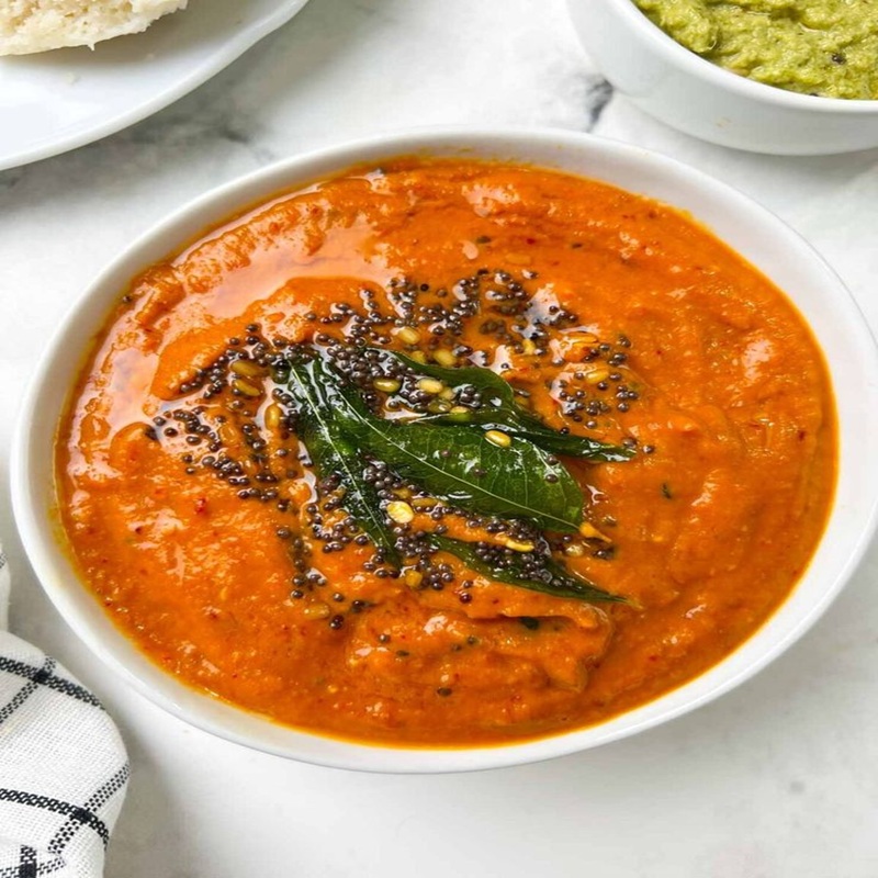 Tomato chutney is made by cooking tomatoes with spices and then grinding them into a thick smooth paste creating a tangy and slightly spicy chutney.